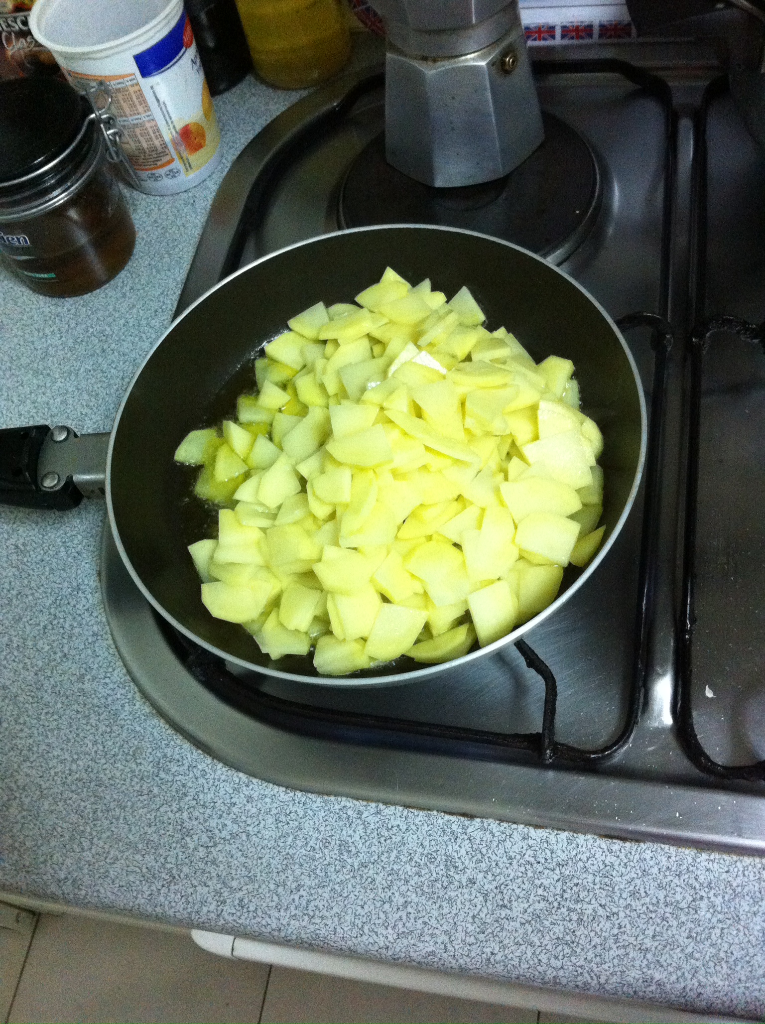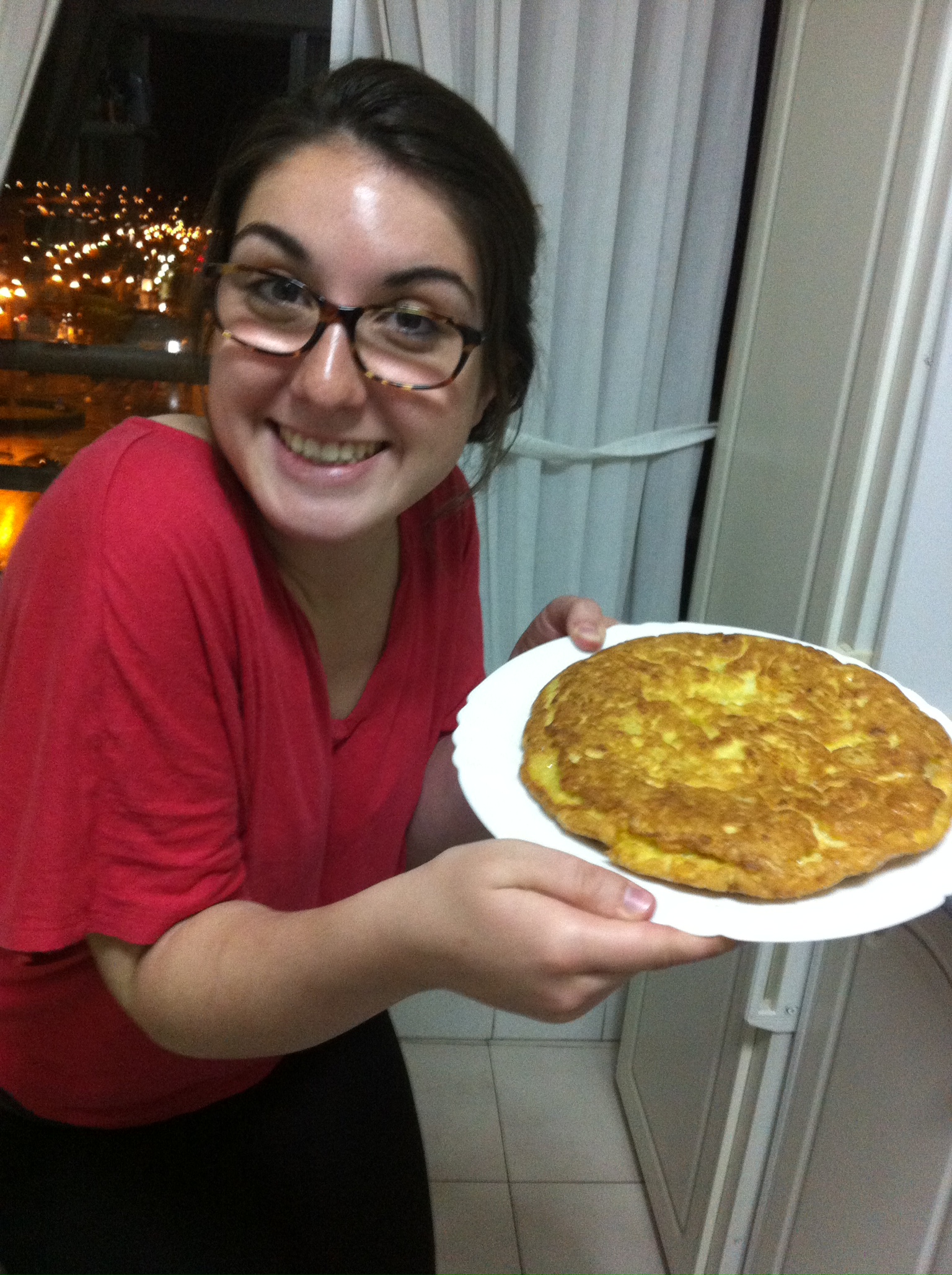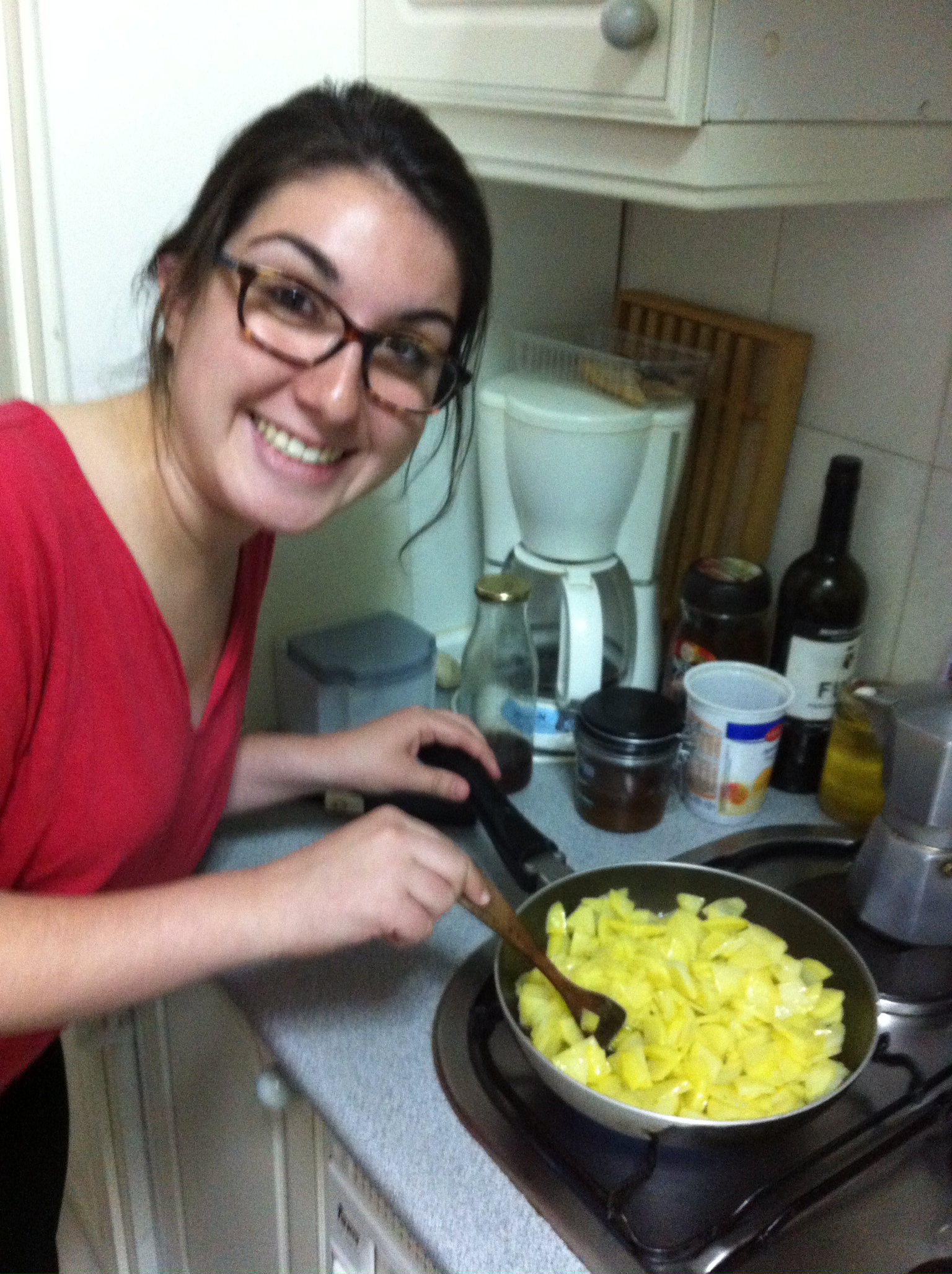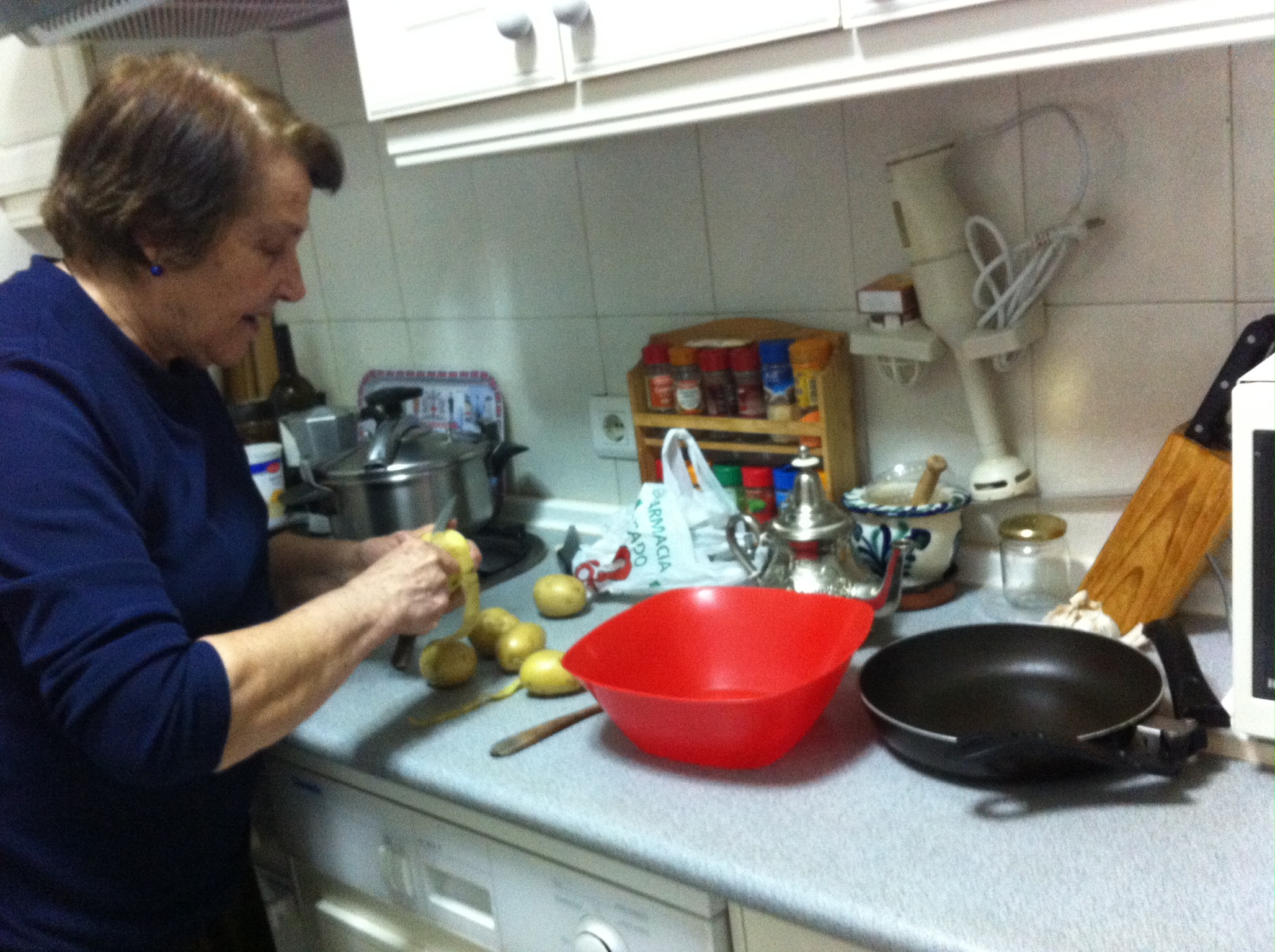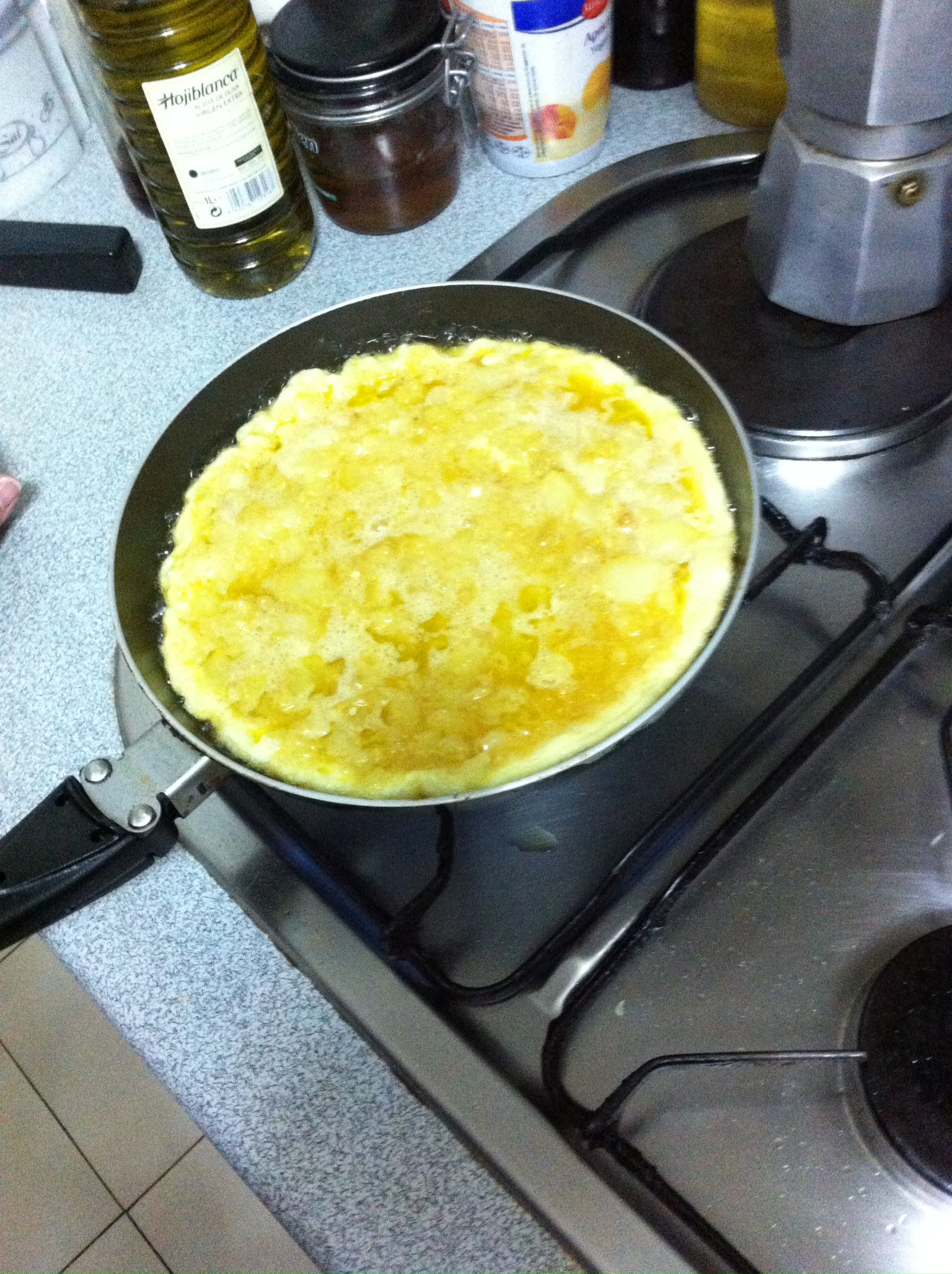 Last weekend, on a particularly rainy evening after a weekend of seeing Madrid and Toledo, Spain (to be written about soon!) Teresa decided that it was a good time to teach me how to cook tortilla española, a Spanish potato and egg omelette. While it is a simple process, the part that marks anyone as a true Spanish cook is the ability to dar la vuelta a la tortilla, or flip the tortilla. Therefore, I have decided to share what I learned, as well as the photos of the process: